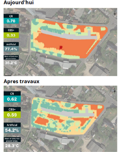 La réduction des surfaces minérales, combinée à l’introduction de strates végétales diversifiées (arbres d’ombrage, haies, massifs), permet un gain thermique mesuré de près de 7°C au niveau du sol.